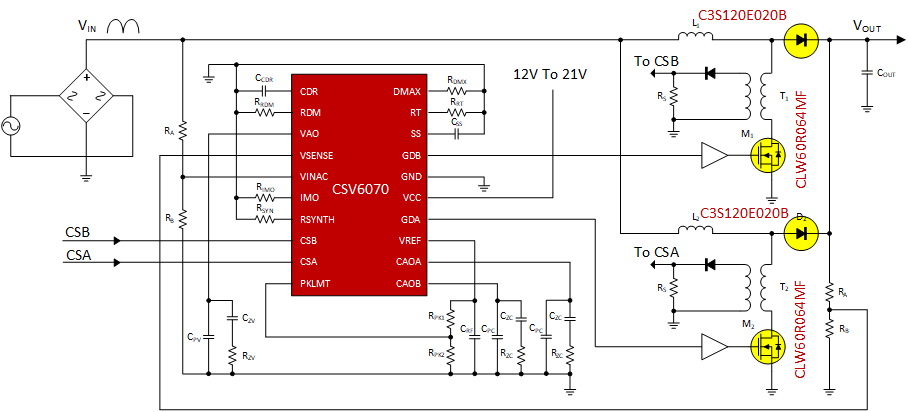 在功率较大PFC解决方案中,会经常使用交错架构。CSV6070可同时控制两相PFC电路,通过相移控制实现了PFC输入电流纹波减弱的同时,完成了功率扩展。应用框图如下: